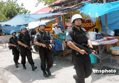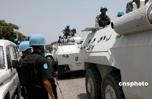 海地太子港7月7日消息:海地前总统阿里斯蒂德的支持者在海地太子港德尔马斯和玛尔提桑地区举行示威游行,示威者焚烧轮胎,设置路障,在示威的人群中不时传来枪声,联海团对事态的发展严密关注,中国防暴队加强警戒,防止事态进一步蔓延。目前中国防暴队在任务区保持高度戒备,进一步加强危险地区武装巡逻和路面控制,随时准备打击袭击联海团成员的武装分子。中新社发 陈 进 摄