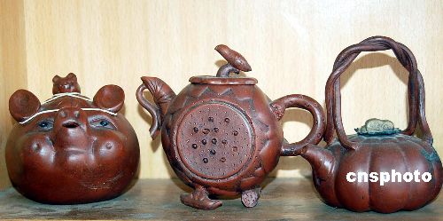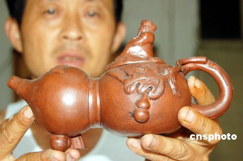 7月6日,安徽界首一市民在展示一款“另类”紫砂壶。造型各异的“个性”紫砂壶兼具实用性和艺术观赏性,受到人们的喜爱。中新社发 王彪 摄