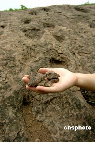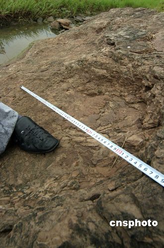 7月15日,在山东省郯城县马陵山,考古人员正在测量一批足印化石。几天前,当地群众在一处山凹的坡面上发现了70余个大型动物的足印,这些足印共分5处,呈正常行走时的形状分布在50多平米的范围里,其中最大的足印长约85厘米,部分能明显地看到大型鸟类爪尖的抓痕。据考古专家初步签定,这些极有可能是恐龙足印化石。因为此山是我国东部最大的一条地震断裂带,它的山体形成于7000万年至1.4亿年前。恐龙脚印化石的形成条件比恐龙化石更为苛刻,所以发现的这批足印化石格外珍贵。但这些足印化石具体形成于哪个时期,还有待于进一步考证。中新社发 朱武涛 摄