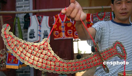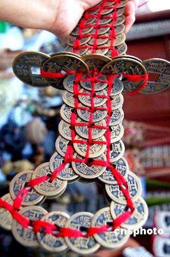 6月28日,重庆市云阳县张飞庙景区古玩市场,一名收藏爱好者展示他用380个清朝时期铜钱制作的“大刀”,吸引不少人。这把奇特的古铜钱“刀”,系用红丝线将铜钱串在一起镶成,“刀”长0.7米,重2.5公斤。中新社发 周斌 摄