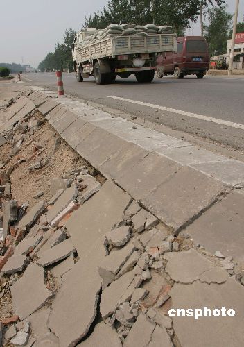 7月4日11时56分河北文安发生5.1级地震,中新社记者在从北京赶往震中途经文安以北约七十公里的固安106国道时,已能见到路基护坡轻微受损的情况。这次地震震中位于北纬38.9度、东经116.3度的隶属河北省廊坊市的文安县,北距北京约120公里。中新社发 邹宪 摄
