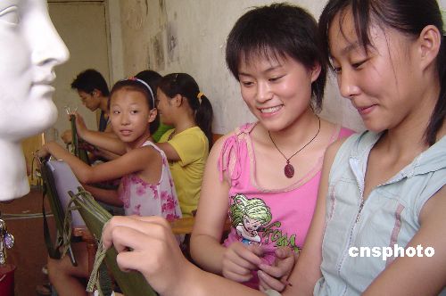 7月8日,河南大学美术系的大学生李天窄(右2)在为一名学生辅导素描技法。当日,共青团河南省委组织的“践行荣辱观、服务新农村”暑期“三下乡”小分队来到该县赊店镇,为当地群众义务开展文化、科技、卫生“三下乡”暑假社会实践活动。中新社发 宋同杰 摄