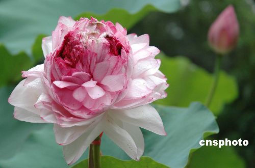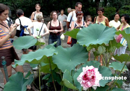 2006年7月11日,极其少见的珍奇荷花三芯“品字莲”吸引了众多中外游人驻足观赏。盛夏时节,苏州古典园林拙政园第十一届荷花旅游节渐入观花赏荷的最佳时节。当天,该园将数株缸栽的一芯“千瓣莲”、二芯“并蒂莲”和三芯“品字莲”及“变异并蒂莲”等珍奇荷花在秫香馆前集中展示,吸引了许多游人观赏。中新社发 朱子寒 摄