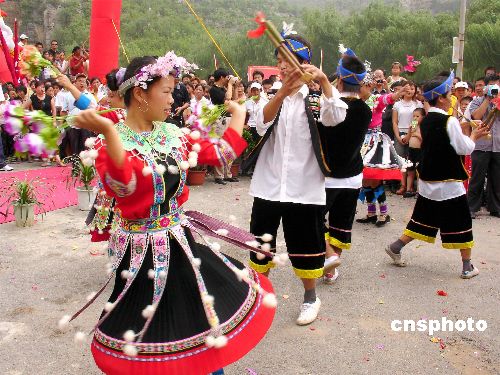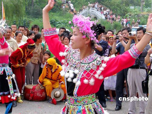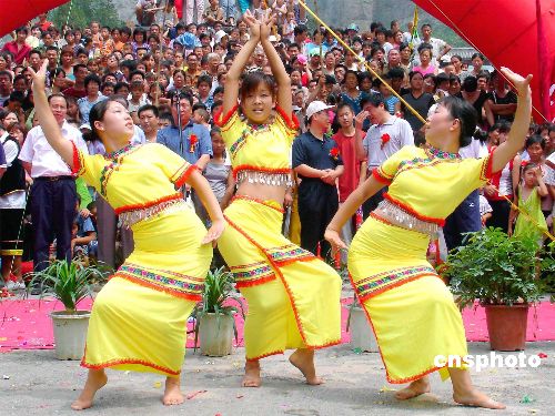 7月15日,河南淇县古灵山风景区第二届女娲山水旅游节开幕。在开幕式上,傣族和苗族少男少女以盛装歌舞表演,迎接来自四面八方的游客。中新社发 李闪闪 摄