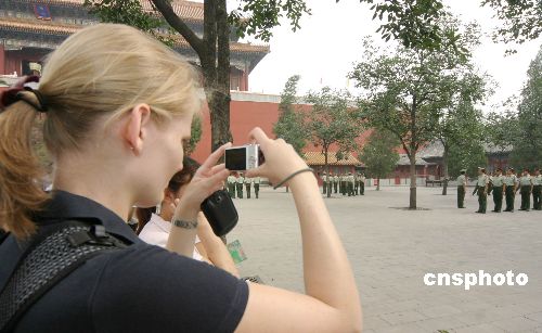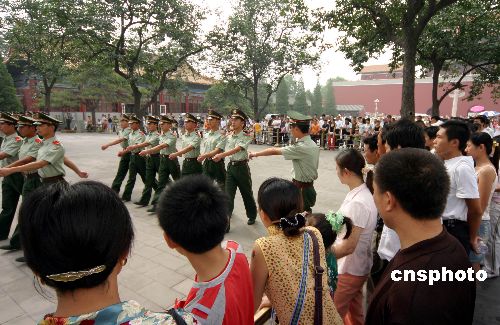 7月20日,北京天安门守卫武警冒着酷暑进行训练,吸引了中外游客驻足观看。中新社发 唐占军 摄