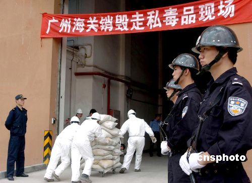 六月二十六日是国际禁毒日,以“参与禁毒斗争 构建和谐社会”为主题的广州海关销毁走私毒品现场活动在广州大学城举行。当天,销毁近年来缴获的海洛因、冰毒、“摇头丸”等各类毒品共计约五吨。图为毒品被集中送往垃圾焚烧发电厂实施无毒害销毁。中新社发 刘卫勇 摄