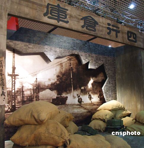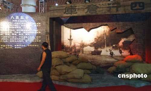 6月26日,《丰碑——纪念中国共产党诞生85周年,上海市爱国主义教育基地大联展》在上海展览中心对公众免费开放。展厅中,伴随着《八百壮士》的悲壮乐曲声,满布沙袋、弹药的四行仓库抗日纪念地的仿真场景震撼人心,在这里,中国共产党带领仁人志士用热血与生命奏响了一曲爱国主义的壮丽凯歌。 中新社发 井韦 摄