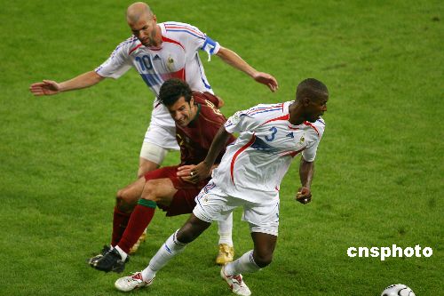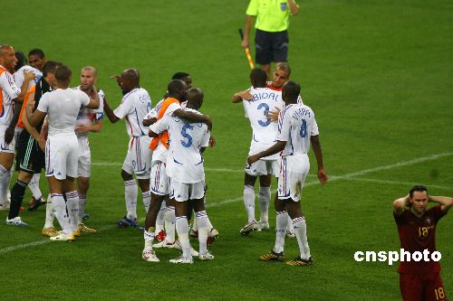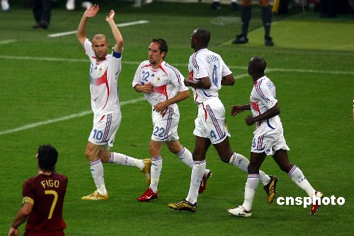 北京时间七月六日凌晨(德国慕尼黑当地时间七月五日晚),世界杯第二场半决赛在慕尼黑安联球场打响,法国最终一比零淘汰葡萄牙,七月九日将在柏林奥林匹克球场与意大利争夺冠军,葡萄牙则在八日与德国争夺第三名。亨利上半时赢得点球,齐达内操刀打进他的第三十个国家队进球。图为齐达内与队友庆祝罚中点球为法国队赢得一分。中新社发 盛佳鹏 摄