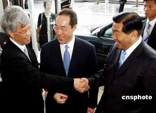 正在香港访问的全国政协主席贾庆林27日中午抵达香港金融管理局参观,香港财政司长唐英年及金融管理局总裁任志刚(左)到场迎接。中新社发 谭达明 摄