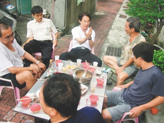 中新网6月29日电 据台湾《联合报》报道,中国国民党大台南市长参选人郭添财日前深入台南市南区,走访21名国民党籍里长。郭添财与里长伯、民众一起在庭院用餐、聊天、听取建议,展现草根性与亲和力。