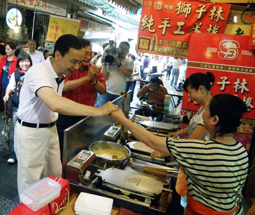 中新网6月30日电 据台湾《联合报》报道,国民党新北市长参选人朱立伦29日走访金山乡金包里老街,沿途握手拜托店家支持,也主动掏皮夹买特产,以行动回馈店家的热情,中午留在金山鸭肉店用餐,乐得商家笑呵呵。