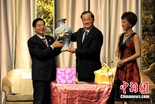拜会结束后,连战与郭声琨互赠礼物留念。 蒋雪林 摄