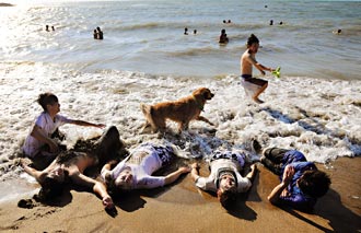 连续几天高温,人和宠物都热瘫了,迫不及待到海边戏水,几个年轻人索性躺在北海岸沙滩,接受浪花“洗礼”消暑。图片来源:联合报 林锡铭 摄