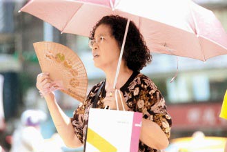 连续多日高温,让民众大喊吃不消,昨天全台最高温快飙到38度,女性民众出门撑洋伞,还得拿出扇子搧搧凉。图片来源:联合报 陈立凯 摄