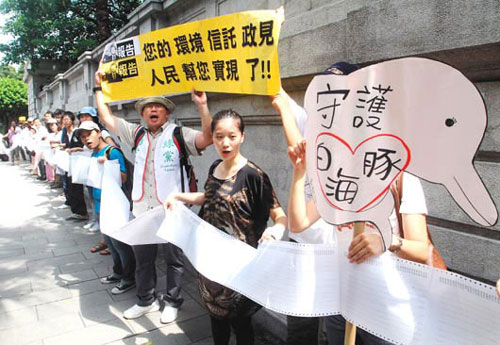 据报道,“抢救浊水溪、守护白海豚。”上百民众6日顶着烈阳,手持500米长的白海豚环境信托认股名单,呼吁当局不要因高耗能、高污染、高耗水的石化产业,阻断濒临绝种的白海豚洄游廊道及栖地。