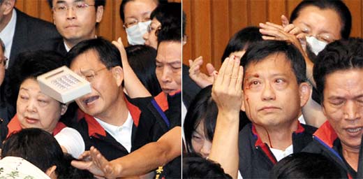 台湾“立法院”临时会昨天下午处理两岸经济合作架构协议(ECFA)径付二读时,蓝绿发生推挤冲突,混乱中,吴育升遭定时器砸中。国民党团昨晚召开记者会,调出录影带显示是黄伟哲所砸。