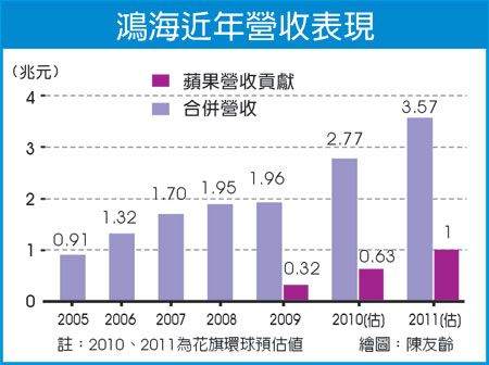 张凯伟更预估,苹果占鸿海营收贡献,将从2009年的3200亿元成长至2010年的6300亿元,2011年则上看1兆元,因此,除非竞争对手能将生产苹果产品的员工人数拉高3倍,否则将难以撼动鸿海的主导地位。