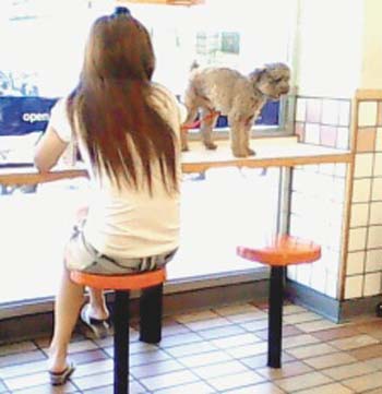 据悉,19日上午九点多,台东一对情侣带着一只小狗到某快餐店,两人坐在长条餐桌的位子用餐,直接把狗放在桌上;狗就在餐桌上走来走去或躺或坐,直到用餐完毕,两人才抱着狗离开。