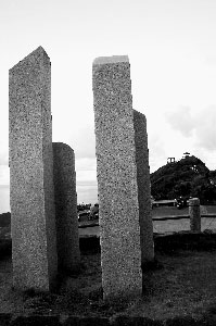 来到绿岛东北角,只见路旁立着四根参差不齐、或圆形或直角的石柱子(下图),刘先生以悲伤的语调说起这背后的故事:十几年前,从台东飞往兰屿的小飞机经过绿岛上空时,突然消失,经过多方寻找始终不见踪影。那四根石柱,就是四条人命,三根直角的代表三个男性,一根圆形的代表女性,石柱高低表示年龄不同。