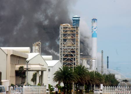台湾麦寮六轻工业区台塑石化炼油二厂25日晚上发生火灾,26日凌晨控制火势,惟残留余烬持续闷烧,黑烟冲天。消防车喷水降温,幸无人员伤亡,起火原因及损失待调查。 台湾“中央社”图