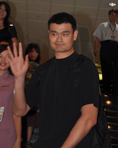 来台参加“2010姚基金慈善之旅”活动的美国职篮休斯敦火箭队中锋姚明(前),26日下午搭机抵达桃园机场,挥手时还故意扮怪脸。 来源:“中央社”