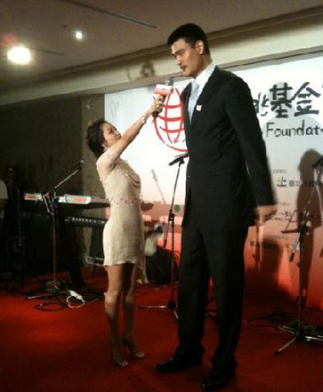 中新网7月28日电 据台湾“今日新闻”报道,台湾美女主播侯佩岑27日为姚明“姚基金慈善之旅”主持募款晚会,两人因身高太悬殊,侯佩岑配合高举话筒采访姚明,她笑言画面呈现就像爸爸带着小孩一样。