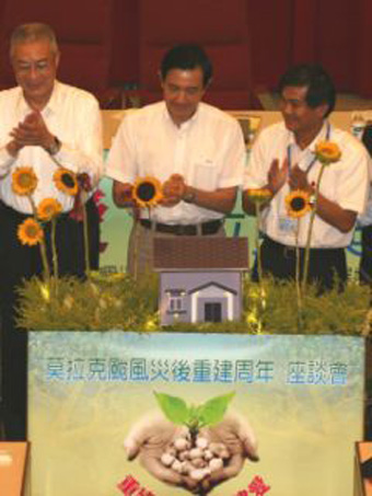 马英九以及吴敦义都参加了“莫拉克灾后重建周年座谈会”。马英九说,“八八风灾”所带来的巨大雨量与造成对土地的侵害更胜已往。经过这次的学习,对于往后的灾变可以预先建立相关制度,像是邻乡村系统、警政系统、消防系统、再来是“水利署”、“经济部”与“农委会”等七个或八个系统,再加上防灾办公室,对于紧接的8、9月份台风季节,采取“料敌从宽、御敌从严”的态度,相信可以防止灾害再度发生。