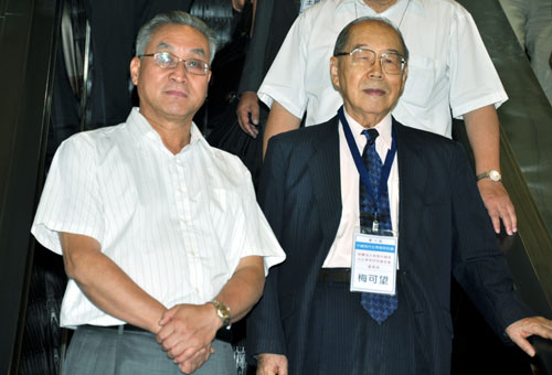 台湾“促进中国现代化学术研究基金会”董事长梅可望(右)接机。