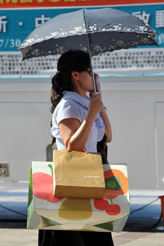 台湾2日高温炎热,但烈日挡不住民众逛街购物的冲劲。