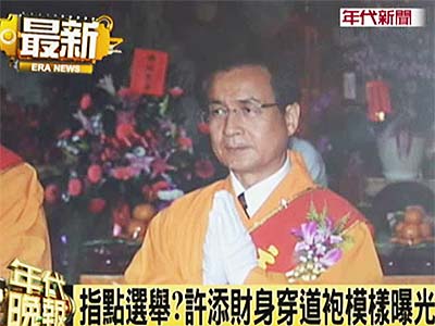 中新网8月6日电 据台湾“今日新闻网”报道,民进党高雄县长杨秋兴宣布参选大高雄市长之后,同党籍台南市长许添财的下一步要怎么做备受外界关注,有媒体取得许添财前往济公庙参拜的照片,直击许添财身穿济公道袍参加法会的虔诚模样。外传庙中的济公师父还曾经给许添财指点迷津,建议他8月8日当天宣布参选大台南。