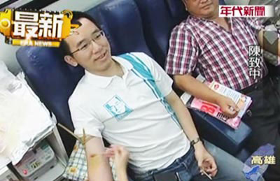 中新网8月9日电 据台湾“今日新闻网”报道,陈水扁之子、高雄市议员参选人陈致中在“父亲节”当天前往捐血中心捐献250CC的血,原本在捐血现场的主持人想替陈致中化解“召妓疑云”,因此在现场笑称“开查某不能捐血”,不料却令陈致中当场十分尴尬。