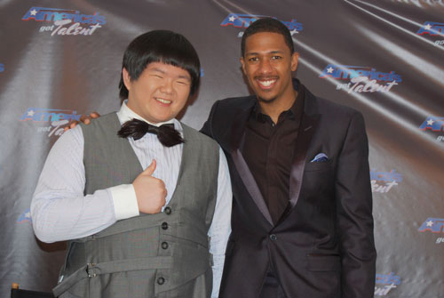“小胖”林育群在美国选秀节目上高歌成名曲《我永远爱你》,完美演出让评审也盛赞唱得比原唱惠妮休士顿还好听。他与主持人甘农合影。 图片来源:“中央社”