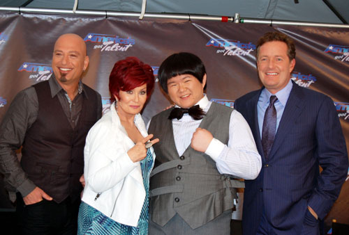 “小胖”林育群在美国选秀节目高歌成名曲《我永远爱你》,评审也盛赞唱得比原主唱还好听。小胖与评审曼德尔(左1)、奥斯本(左2)、摩根(右)合影。 图片来源:“中央社”