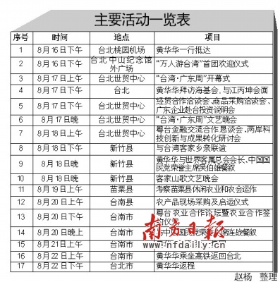 ●2010年8月16日,广东省省长黄华华带队赴台湾举行“台湾·广东周”活动。活动主题为“合作之旅、乡情之旅”,内容包括经贸合作、商品采购、旅游合作、农业合作、文化交流、宣传亚运等,当日还将举行“万人游台湾”首团启动仪式。 (记者 陶达嫔 邓红辉)