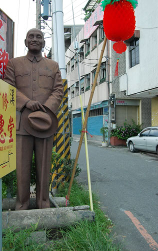 台湾宜兰礁溪1家餐厅业者将自己搜集的蒋介石铜像立在马路边当招牌,不担心因为顾客政治立场不同影响生意。 图片来源:“中央社”