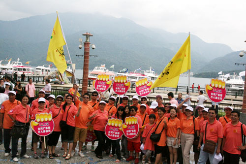在日月潭游艇停泊的入门广场,几十名来自广州“广之旅”的游客兴高采烈地摆出姿势拍照。其中一位女游客说,几天的台湾游花费了逾8000元人民币,包括1000多元的手信。