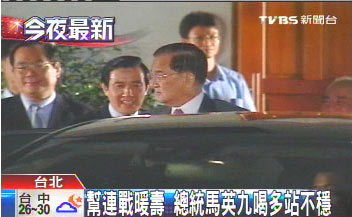 等到要离开时,他只能挨着连战,肩并肩的走,看他脸红红走不稳,似乎只剩下这一抹微笑,在说“我没醉、没醉啦”。