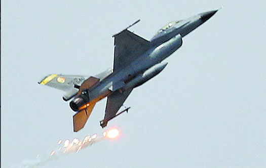 F-16战机发射曳光弹,干扰车载剑一飞弹的追瞄。