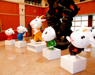 “好可爱喔!”这五只广州亚运吉祥物,每只高约一点七公尺至两公尺,昨天上午运送至桃园县议会时,吸引不少议会员工的目光;据了解,这五只羊造价近六十万元新台币。