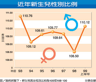 此外,除了高龄产妇产下男婴机率较高,从“健康局”分析来看,第三胎起,男女婴比也严重失衡,甚至达120多比100。李茂盛说,岛内每年透过人工生殖产下的婴儿约2000多名,不可能因此造成性别比例失衡,“不孕的人通常只求生得出来,不见得会挑性别”。