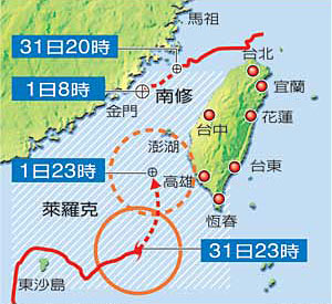 台湾气象部门预计,台风形成的暴风圈未来可能将横扫过台湾东南部及中南部陆地。31日凌晨,台湾中南部地区迎来暴风雨,传出零星灾情,台中已有一人丧生。