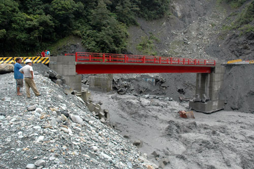 2009年“莫拉克”台风过后卑南溪上游新武吕溪床涨高20几米;2日“莱罗克”台风过后又下降20几米,比原河床还