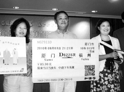 “11年前我就是搭第一班‘小三通’轮船去福州,今天(9月3日)又在台湾买到了第一张动车火车票,真是感慨万分。我上次回福州还要自己在厦门排队买车票,这次就不用了,真是太方便啦。”3日上午,福州台商张鸣龄先生兴奋地从台湾三菱旅行社总经理周惠全手里接过车票模型,宣告大陆动车车票在台湾正式开卖。