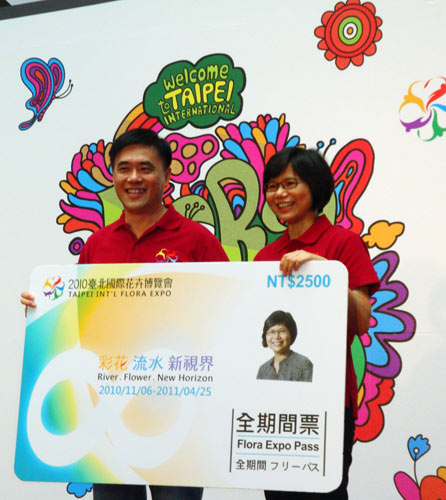 台北市长郝龙斌(左起)与夫人高阆仙10日出席花博记者会,郝龙斌说,今年中秋可能忙于花博不在家,所以自掏腰包,送太太1张价值新台币2500元的全期间票。