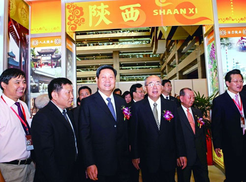 当日上午九时许,在悠扬古朴的秦腔曲牌声中,“陕西风情节”在台北世贸中心拉开帷幕,近百家企业的300多种产品吸引了诸多台湾民众。赵正永、景俊海和吴伯雄以及台湾商业总会理事长张平沼等在参观展览之后,出席了活动开幕式。赵正永在致辞中说,两岸经济具有很强的互补性,不断加强交流与合作,对于应对国际金融危机和促进经济持续发展具有重要意义。随着“三通”的实现,陕台两地的交流合作领域不断扩大、态势越来越好。为进一步凝聚共识、互惠发展,在台湾有关方面的大力支持下,我们赴台举办包括“陕西风情节”等许多活动在内的“2010台湾陕西周”,相信这次活动会使台湾企业和民众更多地了解陕西,推动陕台合作向更高层次发展。吴伯雄在致辞中对我省举办台湾陕西周表示热烈欢迎,他说,秦中自古帝王州,陕西是中华文化的发祥地,工业基础较好,资源丰富,有众多的高校和科研单位,与台湾有着良好的往来,台湾陕西周文化交流、认亲拜友、科技联盟的主题,都是与台湾合作中非常重要的问题,陕西也具备这样的条件和基础,希望以这次活动为新的契机,不断推动陕台合作向更多更宽的领域发展。作为陕西省政府高级经济顾问的张平沼,以切身经历说明了大陆与台湾加强合作的重要性,表达了进一步加强合作的愿望。