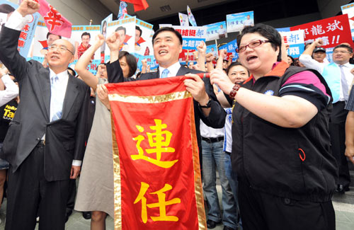 中新网9月15日电 据“中央社”报道,台北市长参选人郝龙斌15日在妻子高阆仙、国民党荣誉主席吴伯雄陪同下,办理参选登记。郝龙斌说,在纷扰的时刻,感谢支持者力挺,并高喊“我一定要赢、我一定会赢、我们会胜利”。