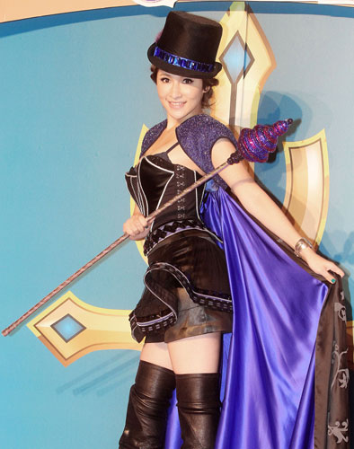 台湾歌手萧亚轩15日在台北代言1家知名网络游戏,以性感俏丽的吉普赛服装亮相。图片来源:“中央社”