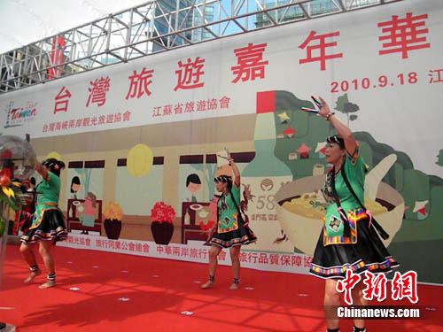 中新网南京9月18日电 (记者 王国安)台湾少数民族的激情歌舞,拉开了台湾海峡两岸观光旅游协会18日在南京举行的户外嘉年华活动序幕,以此方式向江苏民众“面对面”推介台湾游。
