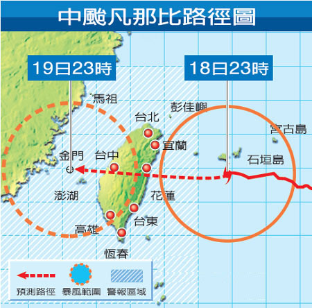 中新网9月19日电 据台湾《联合报》报道,根据台湾气象部门凌晨5时30分最新台风消息,台风“凡那比””(大陆称“凡亚比”)在过去3小时中心风速强度略增,但行进速度不变,从19日0时起到 5时40分,嘉义、宜兰局部地区已有暴雨。