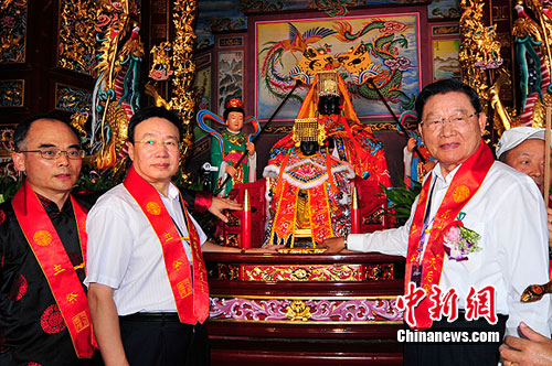 前来参加今天仪式的全国台湾同胞投资企业联谊会会长郭山辉在接受采访时表示,在台商聚集的昆山举行妈祖庙安座大典,可以拉近两岸距离,加深两岸人民深厚感情,让妈祖文化在两岸传递。